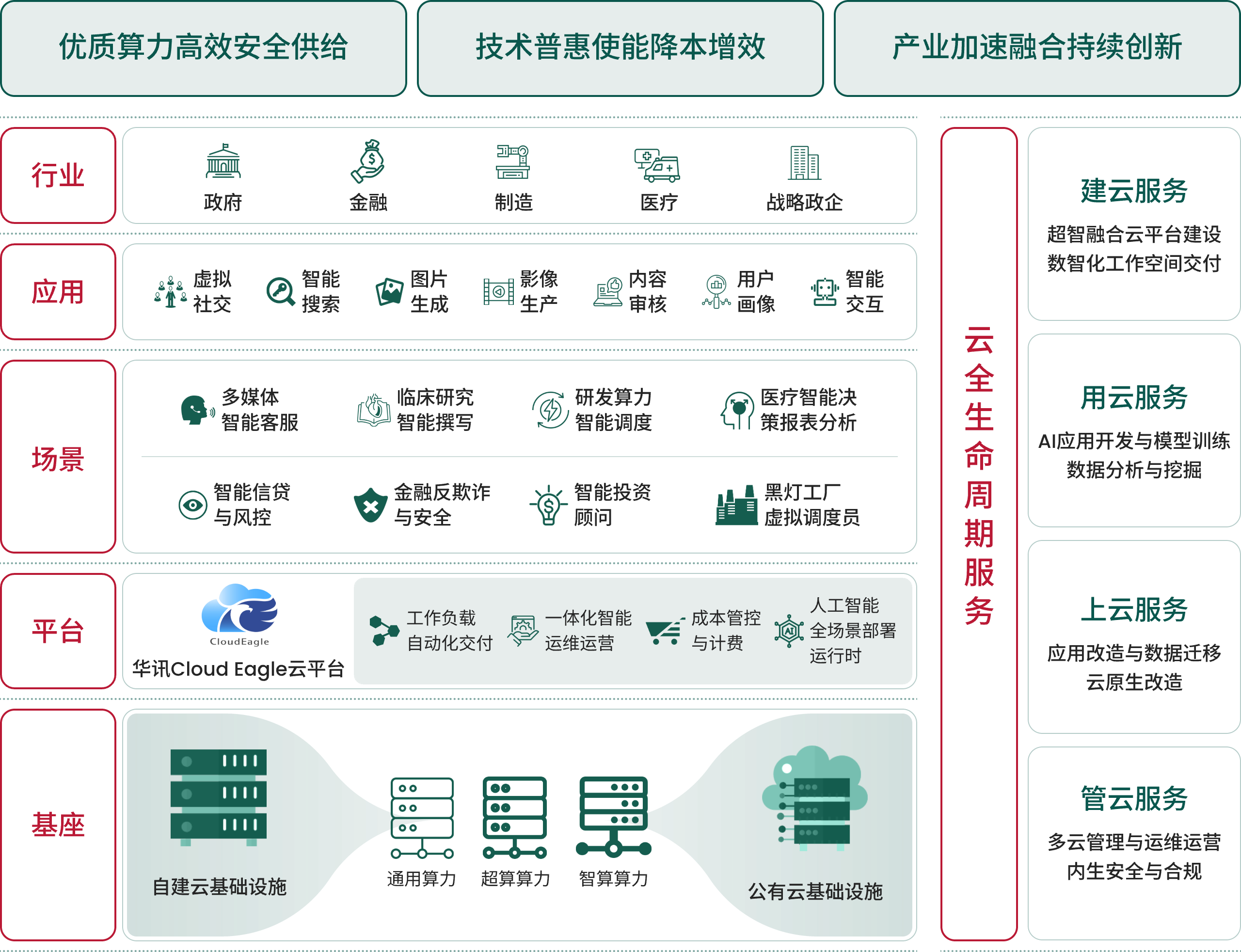 华讯网络云计算解决方案致力于融合AI与云计算的关键技术创新,全面支持以AI重塑云计算的技术架构、服务模式与产业生态。通过协同异构算力,构建算力互联互通的云计算架构,推动云平台从基础资源供给向智能服务平台跃迁,迈向云智一体、云网融合的未来,支撑企业在政企云、数智化工作空间、云上多媒体智能客服等多个场景落地,提供成熟的行业实践,充分释放云网数字生产力。